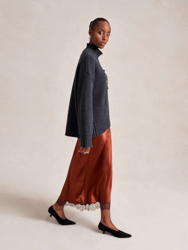 La Ligne Skirt: Not stripes and I also don’t love how they styled this but the skirt itself is great and would look chic with tall boots and a black turtleneck IMO.