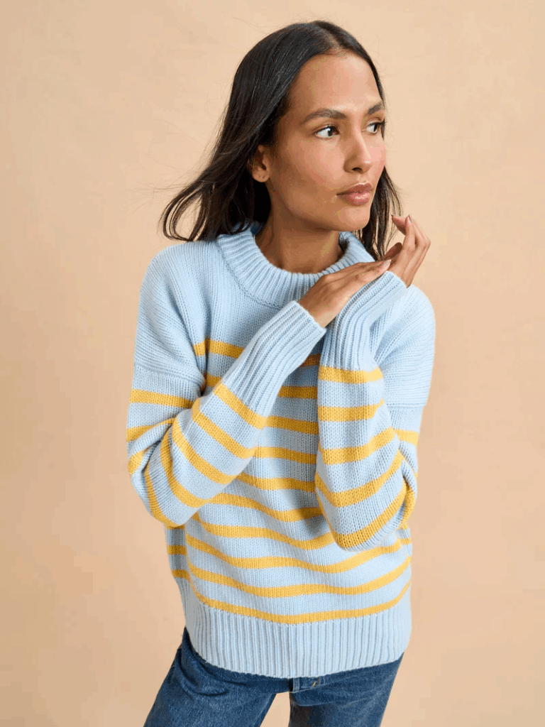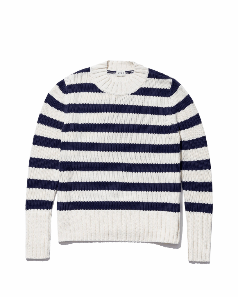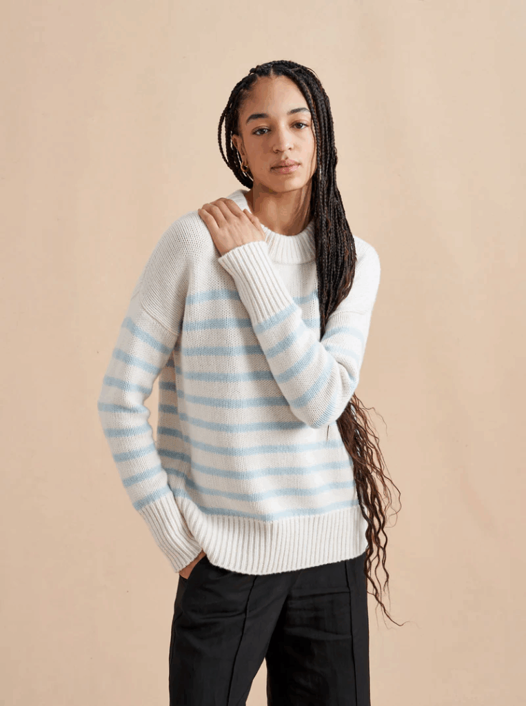 Blue & White Cashmere Sweater: La Ligne has the best color combinations in my view. This one would look great with light blue denim & some cool boots.