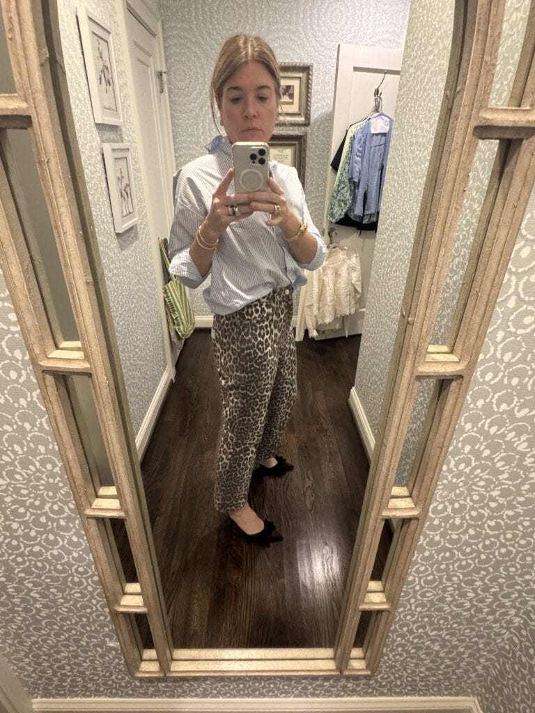 I like how this subtle stripe on an Ann Mashburn button down pairs with these Ganni Leopard Print Jeans.