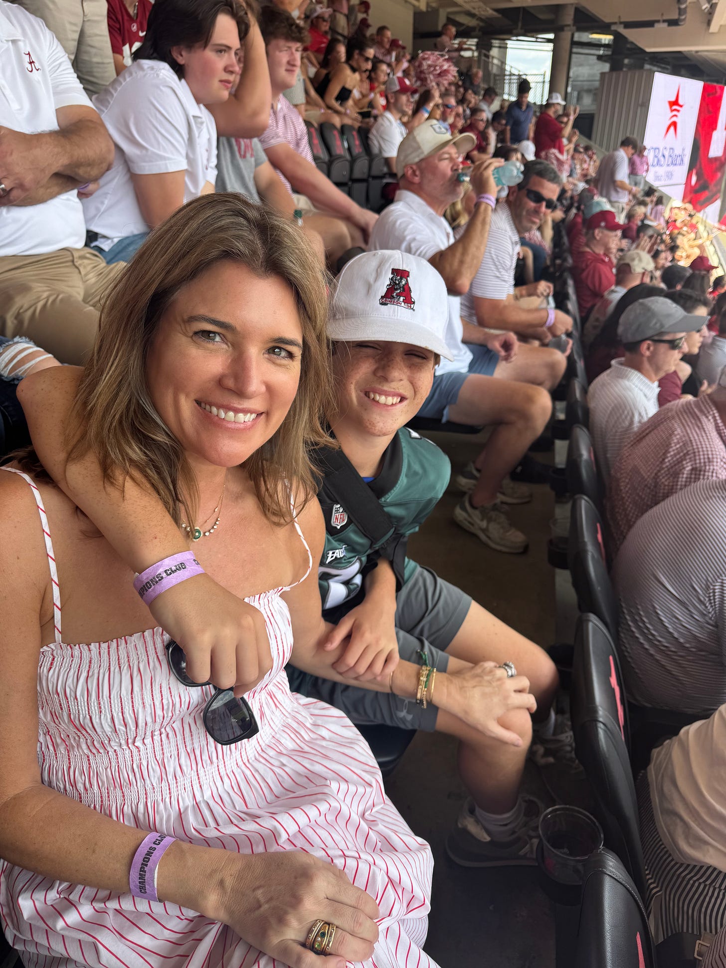 Not pictured: the sweater that I wrapped around my waist in the hopes of manifesting Fall weather in Alabama and promptly tossed on my stadium chair. Dress is Pistola and lipgloss is Nivea strawberry.